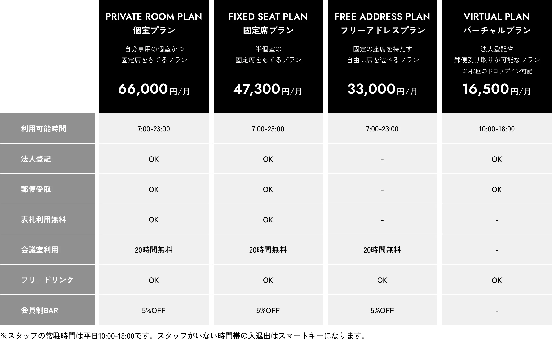 フリーアドレス席とWi-Fi・電源など、基本的な設備をご利用いただけます。